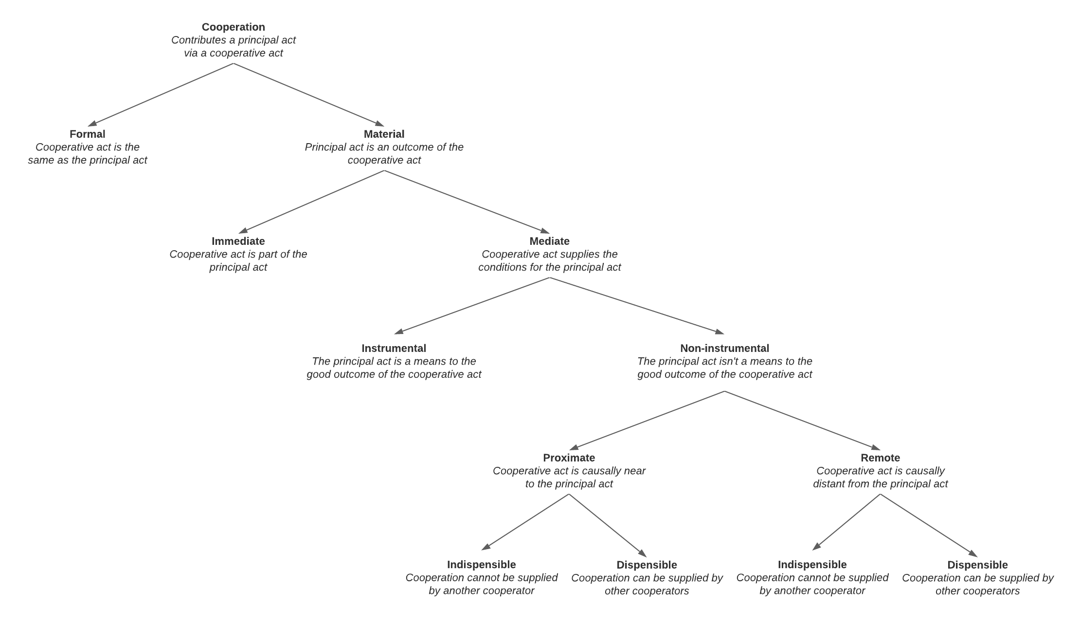 In material cooperation the principal act is not identical to the cooperative act, but in some sense an outcome of it. Stated in the terms of the principle of double effect, the principal act is an effect of the cooperative act. Material cooperation can be divided into immediate and mediate. In immediate material cooperation, though they are not identical, the cooperative act is still in some sense part of the principal act. This happens when the cooperator doesn’t share the intention of the principal agent, but nevertheless engages in part of the principal act for some other reason, such as out of fear. Since intentions determine actions, this divergence in intention results in two distinct actions rather than only one. From the outside, this kind of cooperation might look similar to formal cooperation, since in both cases the cooperator is actively engaged in the principal act. For instance, we might say that Charlie cooperates with Alice in this way when, out of fear, he holds Bob down for Alice to punch him. Immediate material cooperation with an evil act fails on the second condition of the principle of double effect. This is because whenever an act is performed as part of another, then the former is performed as a means to the end of the latter.[8] Since the principal act is evil, the cooperative act is being performed as a means to an evil end.[9] As we mentioned earlier, it follows that the bad effect of the cooperative act (ie. the principal act) is intended by the cooperator.