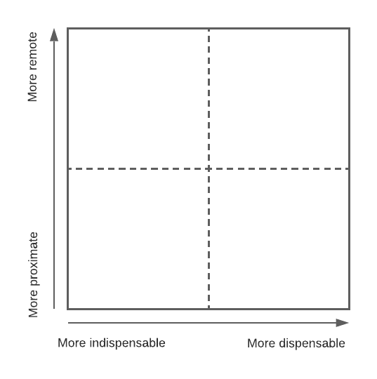 Proximity and dispensability are applicable whenever cooperation is material, mediate, and non-instrumental. Moreover, they are morally relevant because they determine the degree to which the cooperator has influence over whether and how the principal act might occur: the more proximate and indispensable the cooperator is, the more likely they are able to prevent the principal act from occurring at all, or at least reduce the chance or degree of its success. We describe this all with terms like “the degree to which”, “more likely”, and “reduce”, because neither proximity nor dispensability are not discrete notions, but fall along a spectrum. Together, they make up a 2-dimensional spectrum which we can visualize as follows: